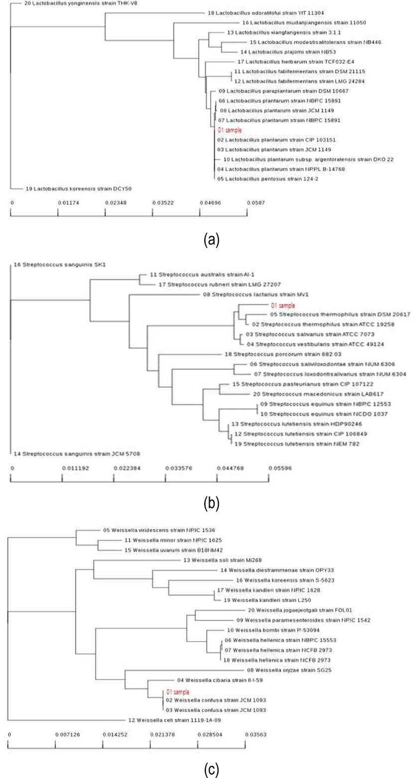 위 과정에서 분리된 유산균 집락을 DNA extraction kit(PowerPrepTM DNA Extraction from Food and Feed Kit, Kogenebiotech, South Korea)로 DNA를 추출하였다. 시료에서 분리한 균주의 신속한 동정을 위하여 16S rRNA sequencing 동정을 수행하였다. 27F(5’-AGA GTT TGA TCC TGG CTC AG-3’)와 1492R(5’-GGT TAC CTT GTT ACG ACT T-3’) primer를 사용하여 중합효소연쇄반응(polymerase chain reaction, PCR, Marsiling Industrial Estate Road 3, Singapore 739256)으로 변성(95℃, 20초), 결합(50℃, 40초), 신장(72℃, 90초) 순으로 30회 반복하여 DNA를 증폭시켰다. PCR 산물은 purify 실시하여 1% agarose gel(invitrogen, New Zealand)로 전기영동한 후 Gel 이미지 분석장치(SYEGENE)에서 UV로 결과를 확인하였다. 염기서열 결정용으로는 27F, 1492R primer를 사용하였으며, 각각의 결과를 보정한 후 BLASTN program(http://blast.ncbi.nlm.nih.gov/Blast.cgi)을 사용하여 해당 균주를 동정하였다. 계통학적 분석은 Clustal X, BioEdit, MEGA 4(www.megasoftware.net/)를 이용하여 염기서열 간의 유전자 거리와 phylogenetic tree를 확인하였다.
